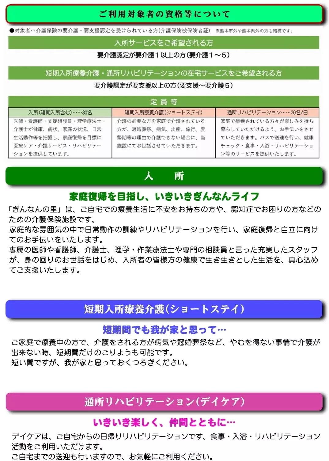 「ぎんなんの里」は、ご自宅での療養生活に不安をお持ちの方や、ご家族が認知症でお困りの方などために1994年(平成6年)に設立された介護保険施設です。