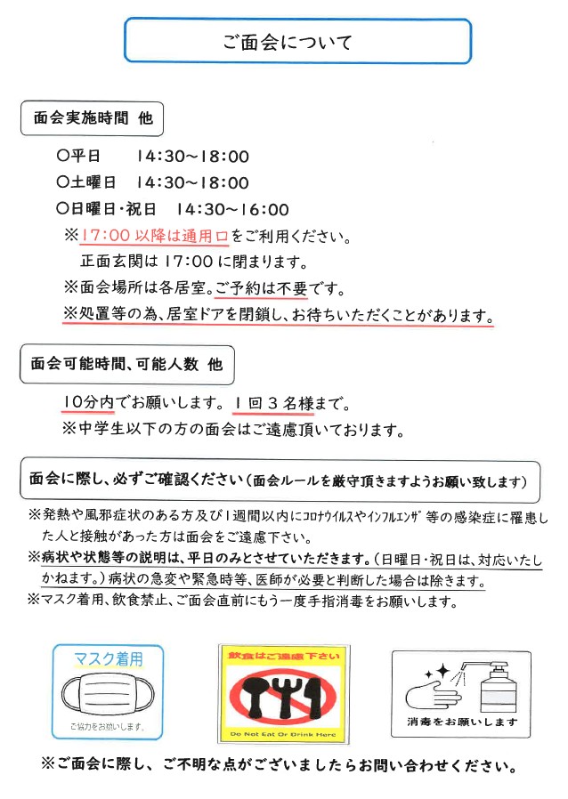 年末年始の面会時間は、下記の通りとなりますので、ご協力の程よろしくお願いいたします。