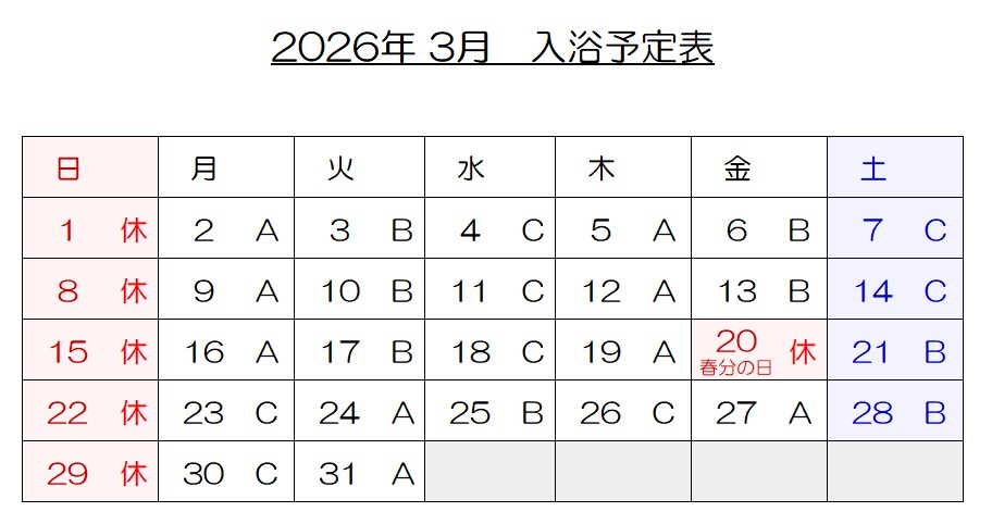 3月の入浴予定表