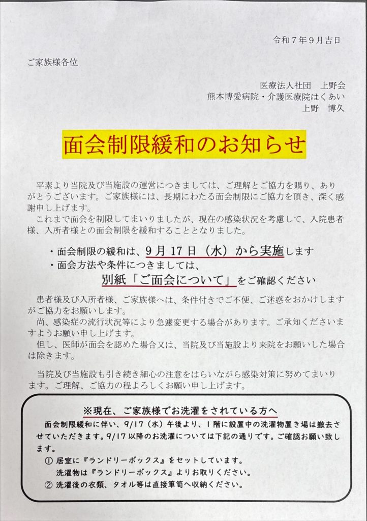 年末年始( 令和7年12月31日(水)~令和8年1月4日(日) )も面会は可能ですが、面会時間が14:30~16:00までとなります。